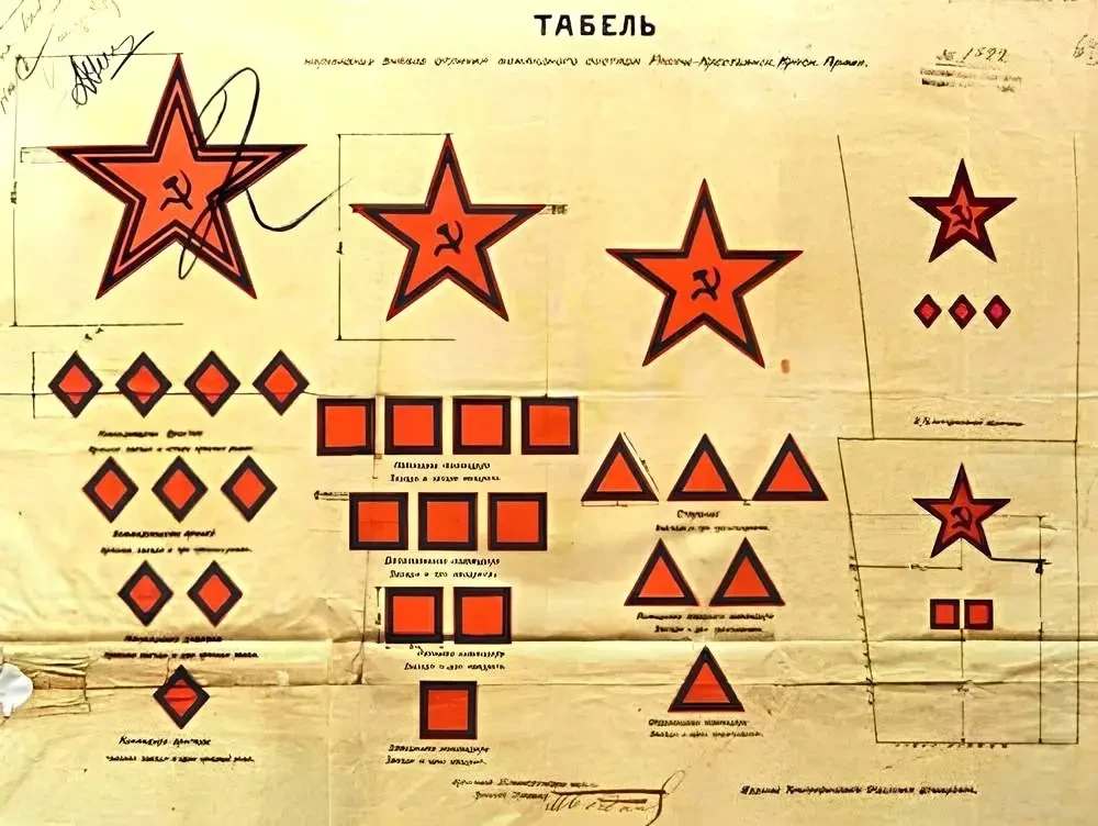 Во второй половине 1918 г. командиров можно было отличить по нагрудному знаку, где в обрамлении венка золотых листьев красовалась «Марсова звезда с плугом и молотом».