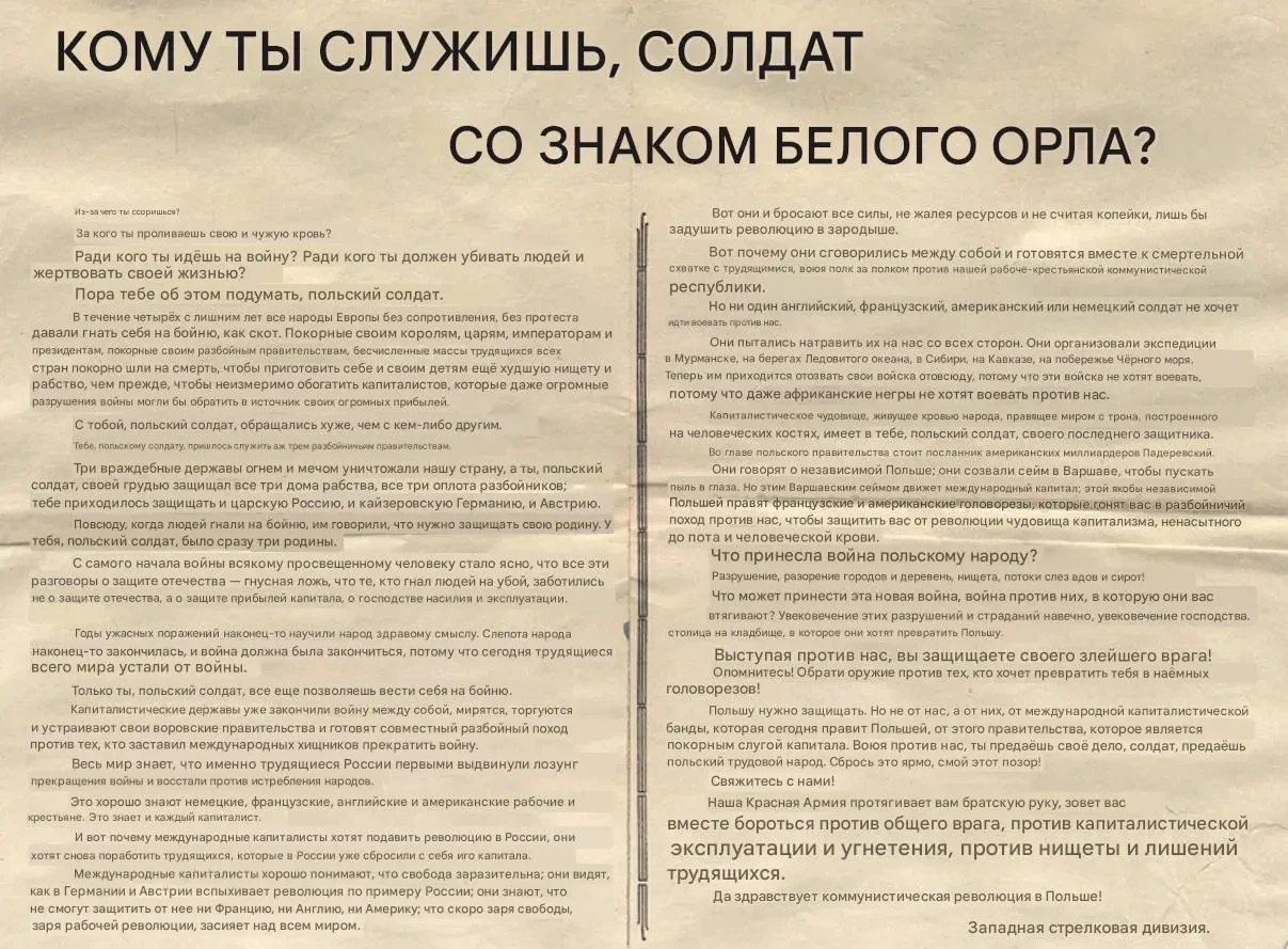 Сказывалось и то, что польская армия также вела свою пропаганду на советские войска. Польские листовки представлены ниже. Фото взяты преимущественно из польских архивов.