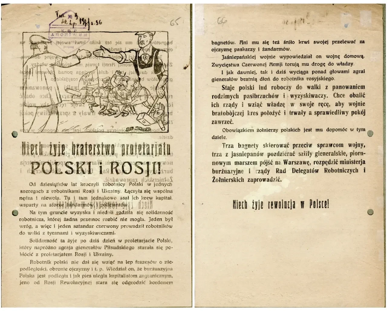 Листовка c обращением ВЦИК к польским рабочим, крестьянам и солдатам «Переходите к нам!». Архив РГАСПИ: КП-104049 ПМ-3375.