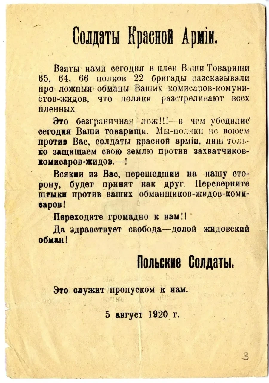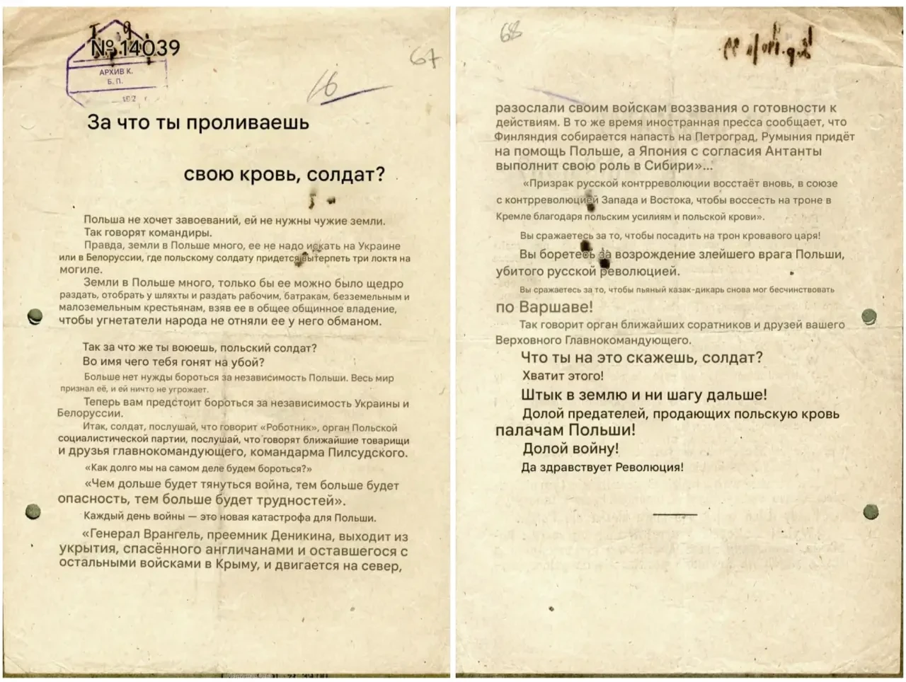 Листовка-пропуск с обращением к польским солдатам. Данный вид агитации использовался советскими войсками уже в 1919 году. Архив РГАСПИ: Ф. 104. Оп. 1. Д. 18. Л. 22–22.