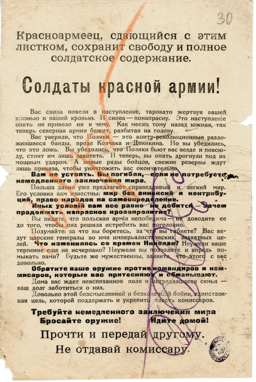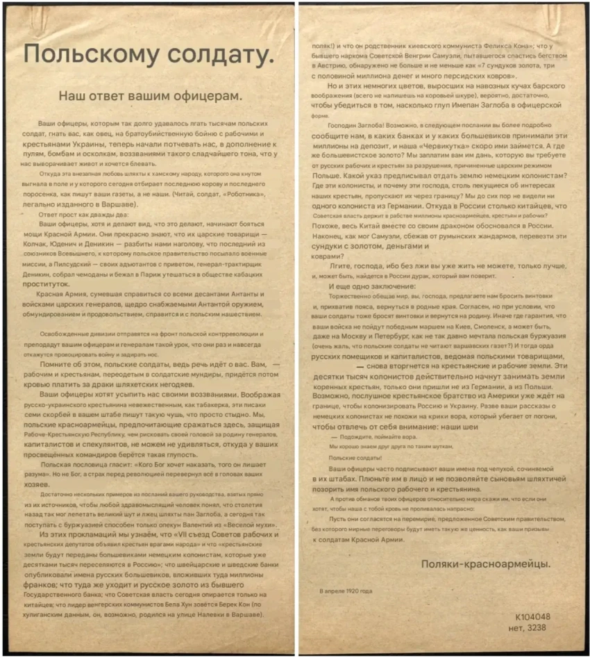 Листовка политотдела РВС Западного фронта с обращением к польским солдатам, воюющим против Красной Армии, не поддаваться антисоветской пропаганде и переходить на сторону красных. Архив РГАСПИ: КП-104049 ПМ-3230.