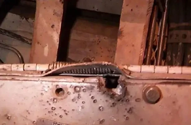 Один из примеров заброневого действия кумулятивной струи. Кумулятивный боеприпас (предположительно граната от РПГ) попал в борт танка «Абрамс» в Ираке. Кумулятивная струя пробила борт машины, прошла через спинку сидения наводчика и зацепила его бронежилет в районе спины.