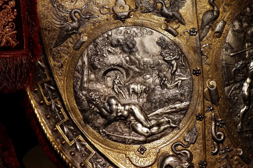 Доспехи эти представляют собой полный гарнитур, включающий и сам доспех для всадника, и абсолютно полный бард, то есть доспехи для коня. По сути дела, это даже и не доспех вовсе, а своего рода произведение доспешного ремесла и искусства: «чистейшей прелести чистейший образец» (А. С. Пушкин). Причем, несмотря на самое пышное оформление, какое только можно себе представить, отделаны они с таким вкусом, что в них нет ничего лишнего. Как об этом уже здесь сообщалось, доспех короля Эрика получил название «Доспеха Геракла», а все потому, что основными мотивами чеканных изображений на нем стали 12 подвигов Геракла, а также события из истории Троянской войны и плавания аргонавтов. Причем всю поверхность гарнитура украшает орнамент, и к тому же все его украшения либо позолочены, либо посеребрены. И очень важной деталью являются парные фигурки Пегаса, выбитые на забрале. Это не просто так, не просто фантазия мастера – это еще и «говорящий» символ красноречия владельца доспеха, в котором Эрик по задумке должен был предстать перед королевой-девственницей Елизаветой Английской.