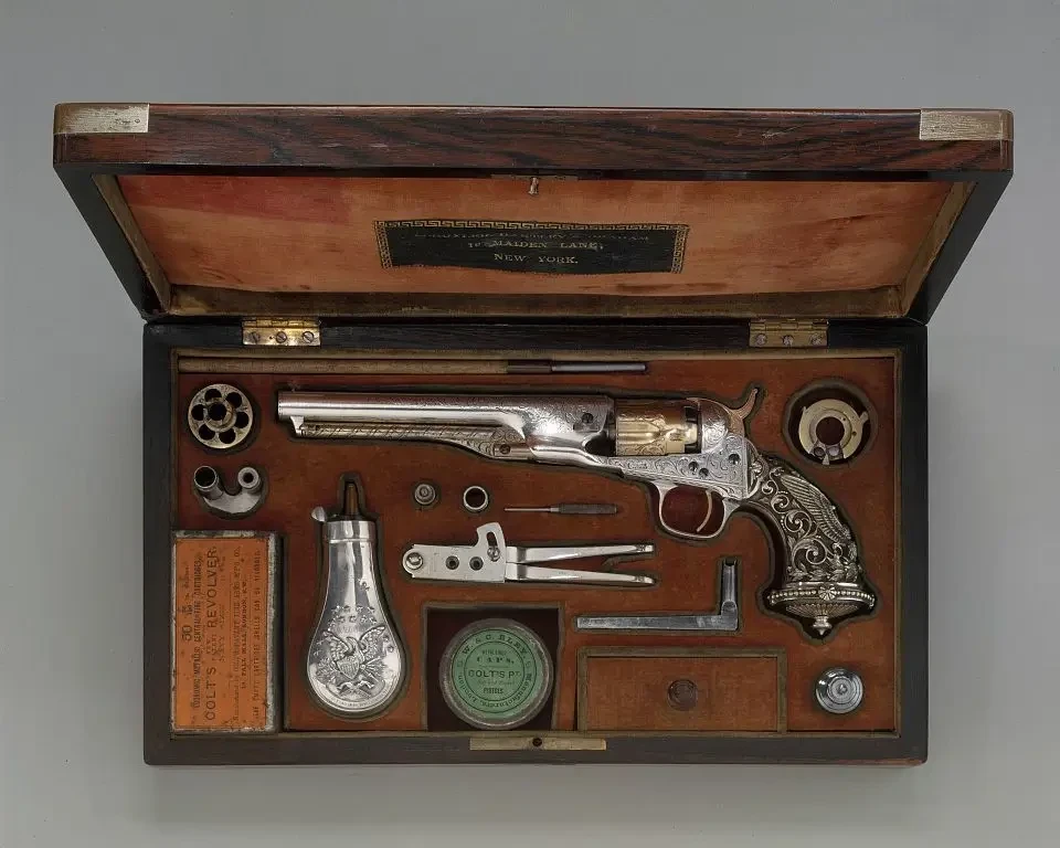 3. Армейский ударный револьвер «Кольт» М 1860, серийный номер 7569, с аксессуарами, произведенный на предприятии в Хартфорде, штат Коннектикут. Год выпуска: 1861. Материалы: сталь, латунь, серебро, золото, красное дерево, текстиль. Длина 36,83 см, длина ствола 20,32 см. Калибр 11 мм