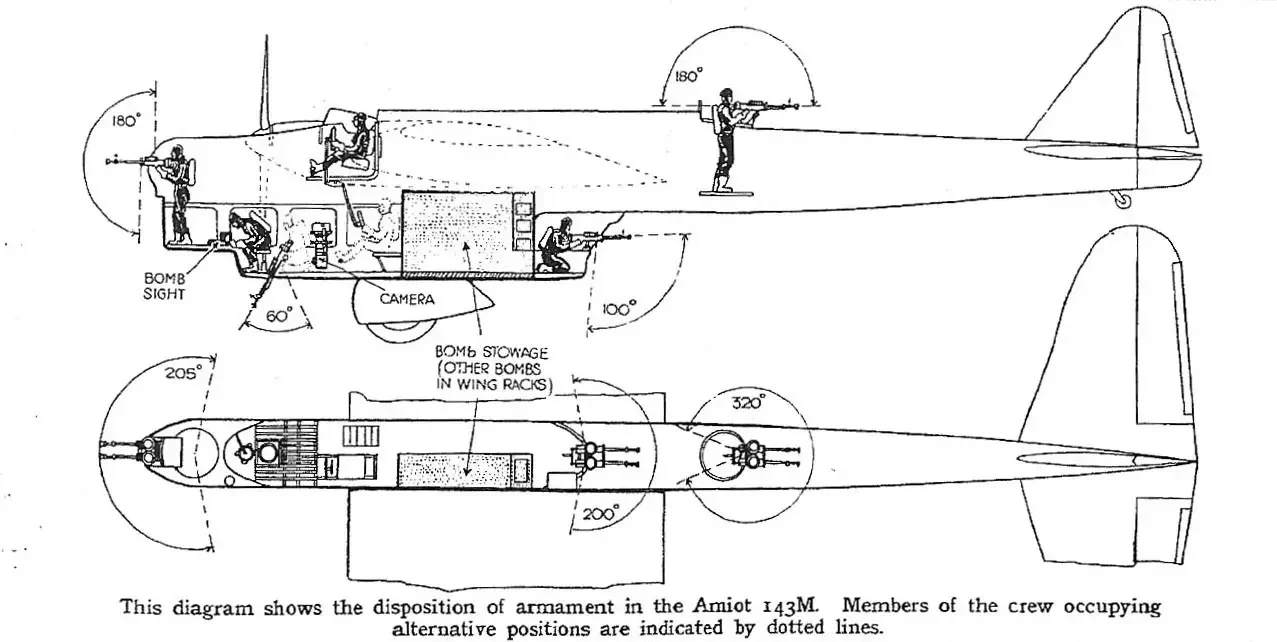 Были планы смонтировать в носовой турели спарку пулеметов Darne калибра 7,5 мм, причем, похоже, только там. Конечно, иметь два принципиально разных пулемета практически одного калибра — довольно странно, но в отношении оборонительного вооружения французские конструкторы никогда не искали легких путей. По крайней мере, пулеметы Darne уже тогда имели ленточное питание. Но французские ВВС отказались от этих пулеметов, спихнув их в морскую авиацию (и, скорее всего, совершенно напрасно — аргументация против них очень хлипкая) и выбрали пулеметы MAC mle 1934, т. е. образца 1934 года. А до их появления решили использовать все те же Lewis, в частности, на Amiot 143-01 в январе 1935 года появилась носовая турель с одинарным Lewis-ом, что, конечно, было большим шагом назад.