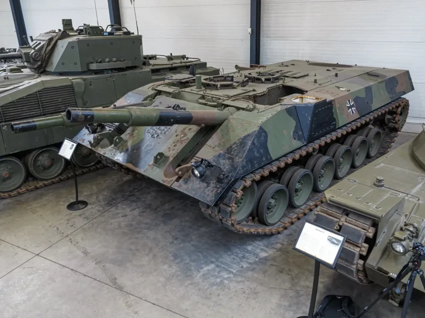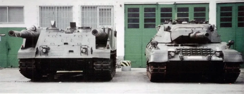 Решили сэкономить и вместо пушек поставили массогабаритные макеты. Массу снизили до 30 тонн. В ходе испытаний прототипов выявились новые ограничения. Например, машине сложно воевать в лесу и городской застройке – там, где классический танк просто повернет башню, казематному придется ворочаться всем телом. Научно это можно назвать зависимостью направления огня от направления положения корпуса танка. Собрали прототипы в 1975-76 годах и, после непродолжительных испытаний, оставили идею в покое. Игра с двумя пушками не стоила свеч. Решено было концентрироваться на разработке танка нового поколения, который более известен как Leopard 2.