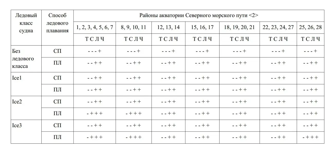 Теперь нам надо бы узнать, какой ледовый класс имеется у «Arctic Metagaz», а для этого найти соответствующее обозначение в символе класса Регистра. Эти символы несколько раз изменялись, с течением времени появлялись новые классы и таблицы соответствия, и неспециалисту разбираться в них неинтересно. Но наш газовоз получил класс Регистра в 2025 году, поэтому символы должны быть самые свежие. Смотрим в таблицу. Ice1 – это, так сказать, самый слабенький класс. Но даже и его в символе Регистра для этого судна нет. Значит, смотрим правила для судов без ледового класса. В столбиках районов видим плюсики и минусики, и из этого понимаем, что во всех районах СМП такому судну разрешается самостоятельное плавание (СП) лишь в условиях чистой воды (Ч), а при ледокольной проводке (ПЛ) – только в легких ледовых условиях (Л). Кроме того, в примечаниях к таблице сказано: