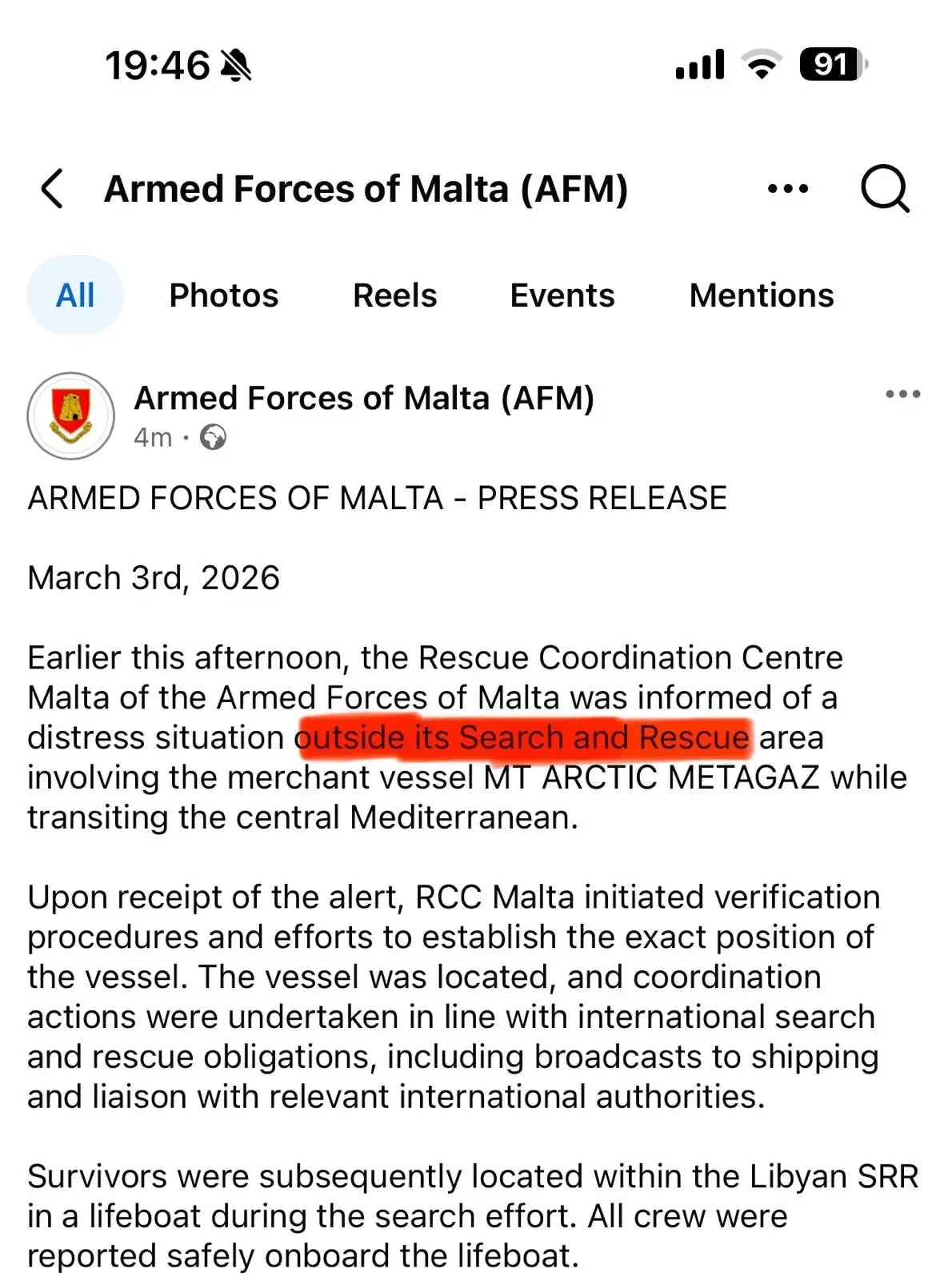 Причем тут Мальта и ее вооруженные силы? Взрыв произошел почти на границе зоны ответственности спасательной службы Мальты (вернее, даже на 3 мили за ее пределами, о чем мальтийцы не устают упоминать), а спасение на море, оказывается, является одной из задач местных вооруженных сил. RCC — Rescue Coordination Centre — является одним из подразделений вооруженных сил. Так вот, согласно пресс-релизу, RCC получил информацию о происходящем «3 марта во второй половине». Откуда поступила информация, не уточняется.