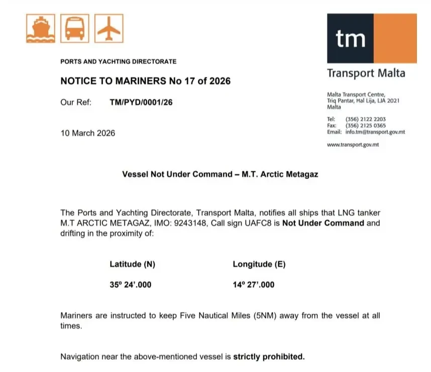 Последнее сообщение Times of Malta на эту тему появилось вечером 5 марта. Согласно сообщению, газовоз находился все еще на плаву, и течением его занесло в зону ответственности RCC Мальты. Мальтийцы сокрушаются, что пока он находится в международных водах, с ним ничего нельзя сделать, но если его занесет в территориальные воды Мальты, тогда… будут думать. Власти надеются, что ущерб окружающей среде будет минимальным.
