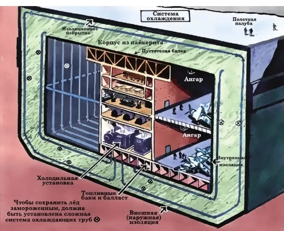 Корпус из пайкерита простой ящичной формы с остроконечными носовыми и кормовыми оконечностями на правом борту увенчивал обычный для авианосца стальной «остров». Для поддержания продольной прочности конструкции служила стальная решетчатая балка, проложенная под верхней палубой. Охлаждение корпуса обеспечивалось разветвленной системой трубопроводов, через которую циркулировал воздух с температурой -30ºС от рефрижераторной установки с шестнадцатью компрессорами.