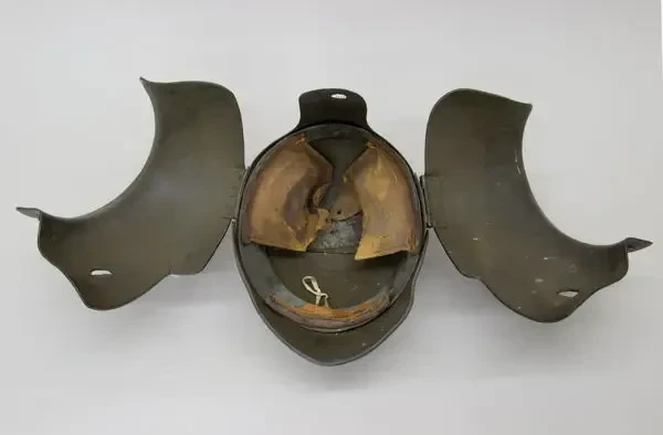 По словам Дина, всего было изготовлено сорок таких шлемов, что делает этот экземпляр особенно редким и ценным. Шлем состоит из четырех стальных пластин, окрашенных в зеленый цвет: одна пластина образует поля и переднюю часть шлема; другая образует заднюю часть шлема с хвостовой частью, которая доходит до основания шеи; боковые части шлема образованы двумя фигурными нащечниками, которые накладываются друг на друга спереди и на края хвостовой части в центре сзади. Пластины шлема соединены заклепками; нащечники приклепаны к одному горизонтальному шарниру с обеих сторон шлема у основания черепа.
