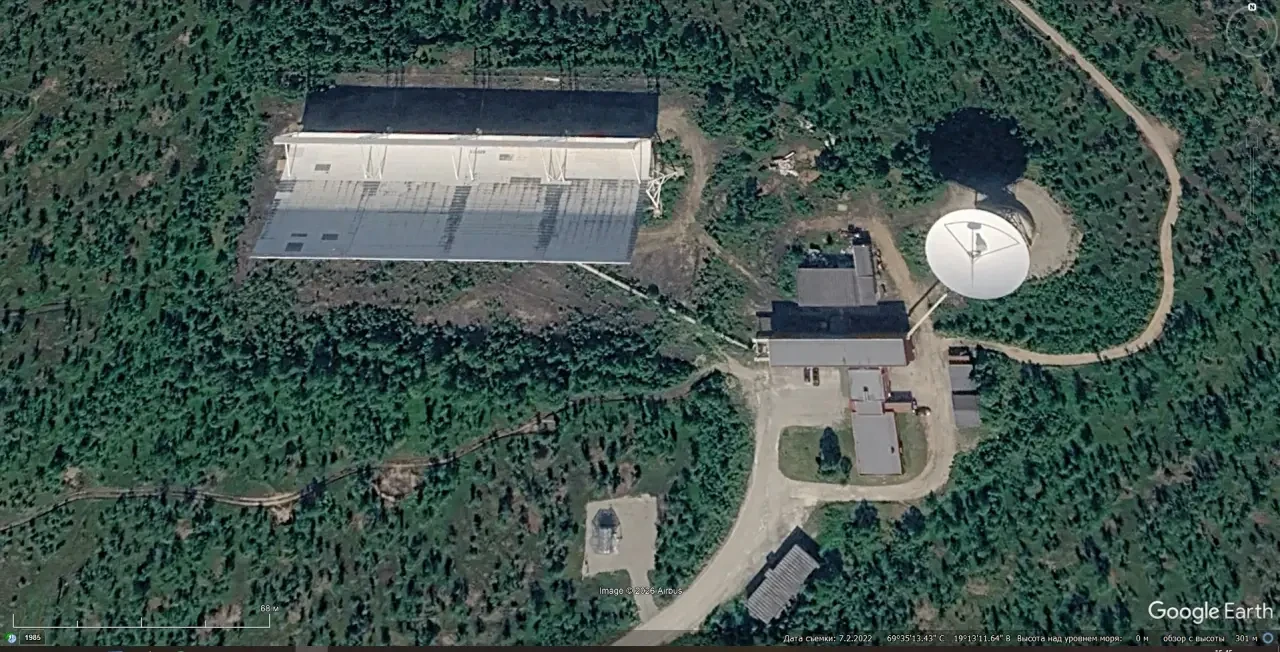 Спутниковый снимок Gооglе Еаrth: элементы радарного комплекса EISCAT восточней Тромсё. Снимок сделан в июле 2022 года