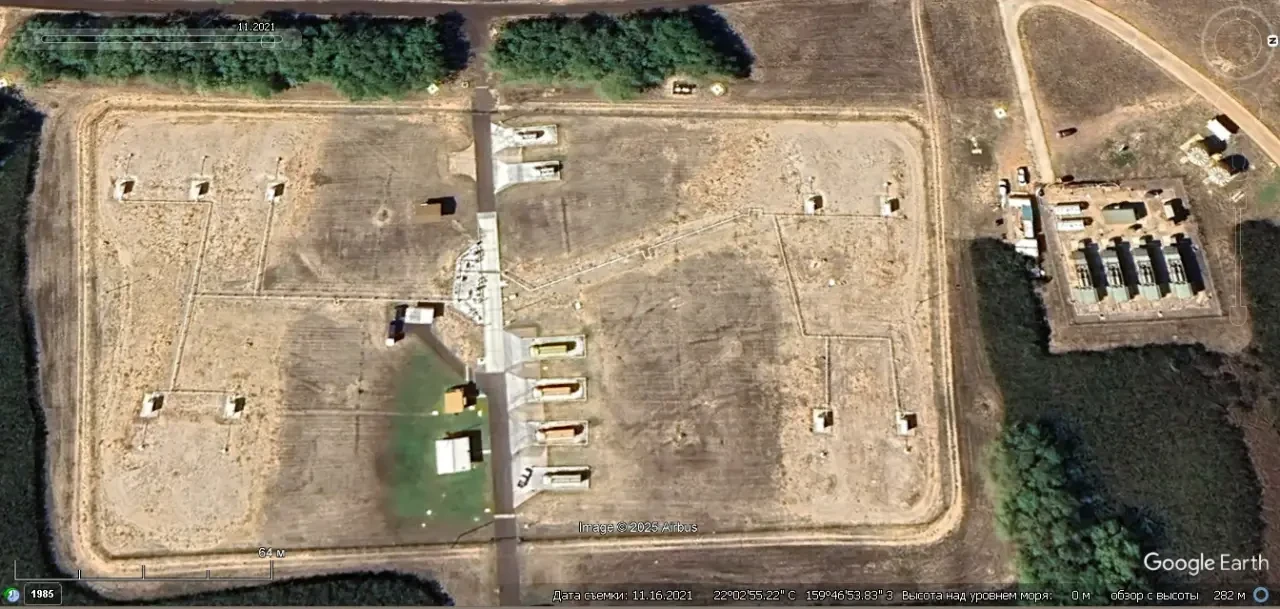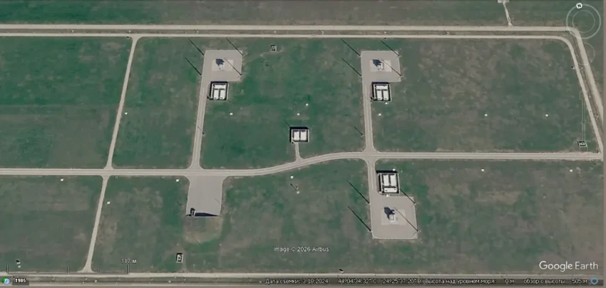 Спутниковый снимок Google Earth: шахтные пусковые установки противоракет GBI на территории базы Форт-Грили. Снимок сделан в августе 2024 года