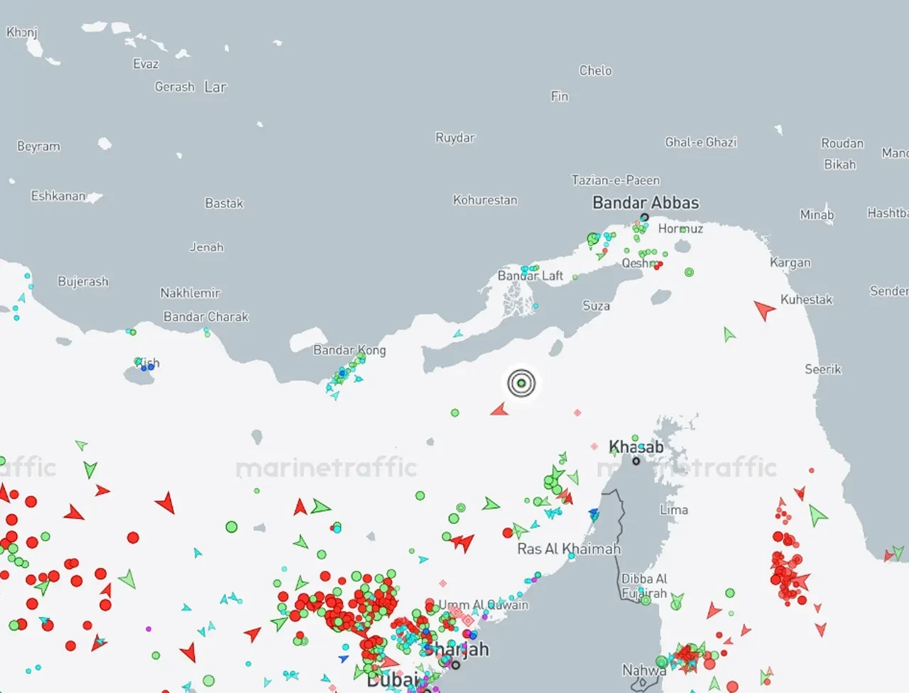 На текущий момент судно находится к югу от иранского острова Кешм. На фрагменте карты от популярного сервиса отслеживания судов обозначено кружком.