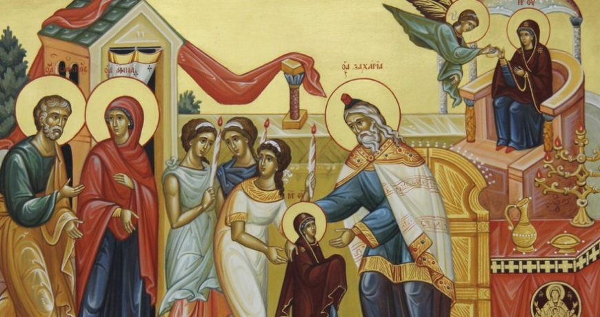 Когда Марии исполнилось 3 года, родители повели ее в Иерусалимский храм. Сопровождали их знакомые и родственники, исполняя священные песни. Чтобы войти в храм, нужно было преодолеть 15 степеней. Иоаким и Анна помогли Марии взобраться на 1 ступень, а все остальные Она преодолела сама. У входа Ее встретил первосвященник Захарий, отец Иоанна Предтечи, и повел в Святая святых. Так Марию озарил Божественный свет, что указывало на Ее избранность.