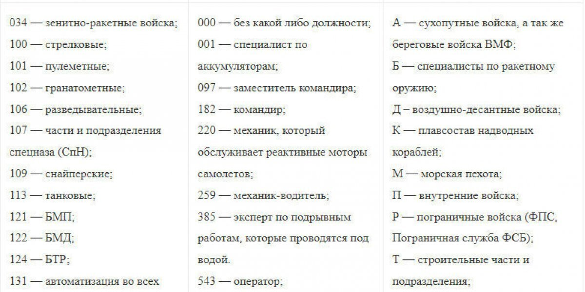 Соответствующий перечень ВУС опубликован в Сети. К примеру, ряд военкоматов заинтересован в следующих специальностях: 100, 106, 131, 166, 878, 879, 113, 554.