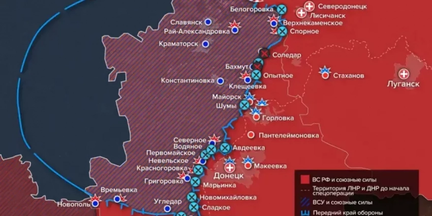 Наши войска продвигаются вперед на всех направлениях, планомерно выдавливая украинские формирования с Донбасса. Ситуация для украинских подразделений складывается катастрофическая, им фактически предстоит выбрать — нести огромные потери и потерять всю боеспособную армию, либо сдать Артемовск и всю линию обороны на этом направлении и отойти к Краматорску. Для России оба варианта приемлемы, ведь судя по всему взятие Артемовска менее важно, чем уничтожение боеспособной группировки противника в огневом котле, в котором сейчас находятся украинские военные.