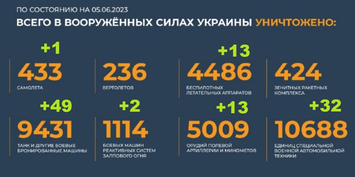 - Министр обороны Сергей Шойгу заявил, что 5 июня украинские военные пытались наступать на семи направлениях силами пяти бригад, но были остановлены. По его словам, ВСУ потеряли 1600 человек, уничтожено восемь танков Leopard.
