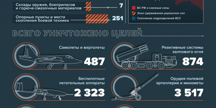 Авиация, ракетные войска и артиллерия поразили пункт управления ВСУ в районе Новотаврического Запорожской области. Также целями ударов стали позиции артподразделений и места сосредоточения противника в Херсонской, Харьковской и Донецкой областях. Кроме того, в указанных регионах и городе Николаев разгромлены пять складов боеприпасов ВСУ, а в Днепропетровской и Черкасской областях — нефтехранилище с дизельным топливом для военной техники националистов и склад с авиационным горючим для воздушных сил Украины.