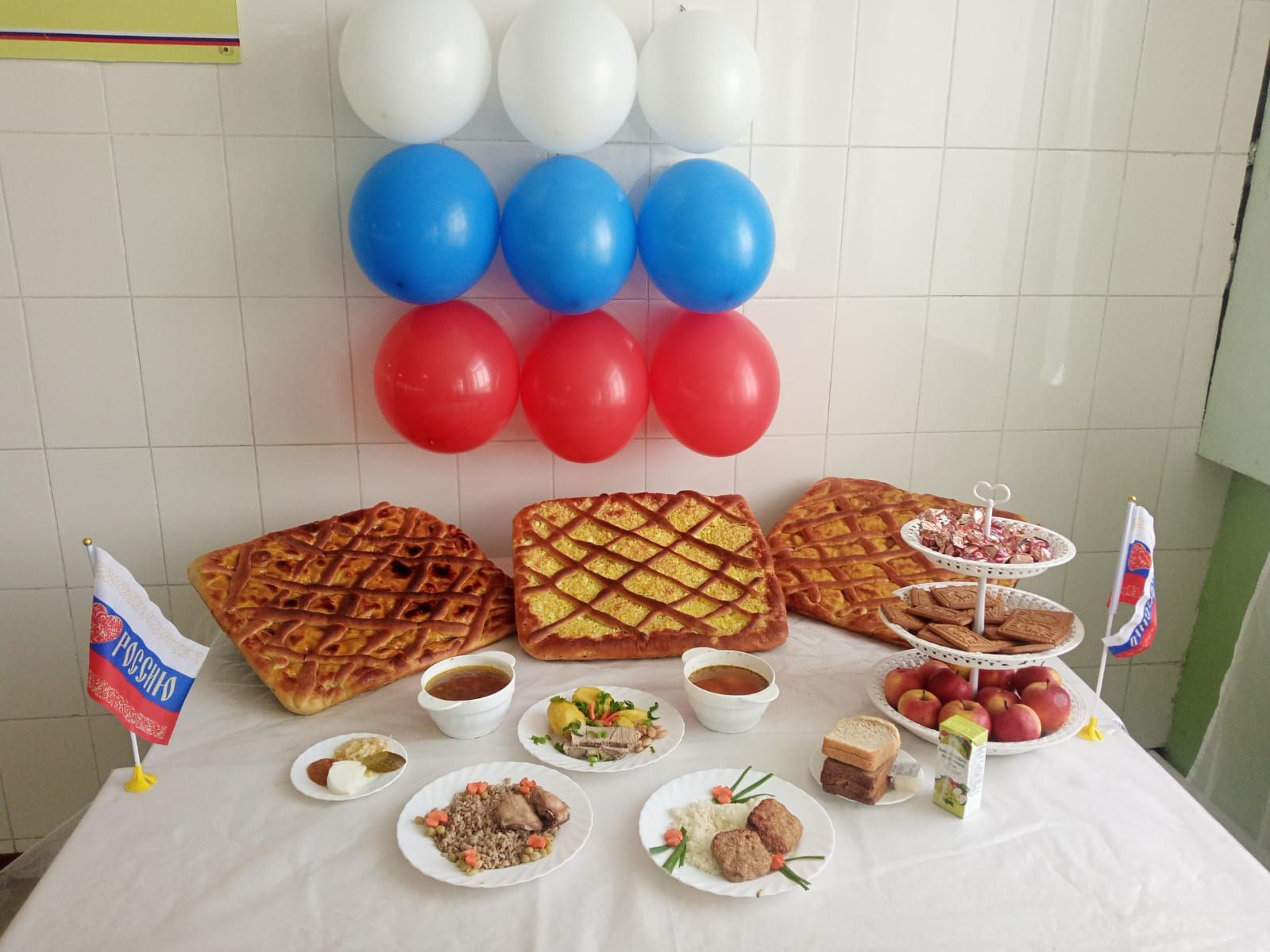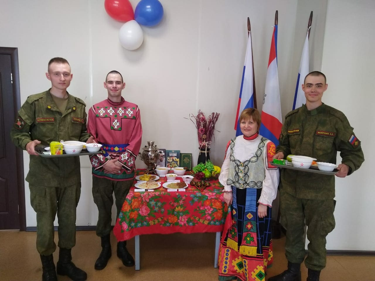 Так, в воинской части города Лиски (Воронежская область) сотрудники кухни встретили питающихся в национальных костюмах. В честь праздника там провели День русской кухни. На стенах – шары цветов российского флага, на столе – самовар.