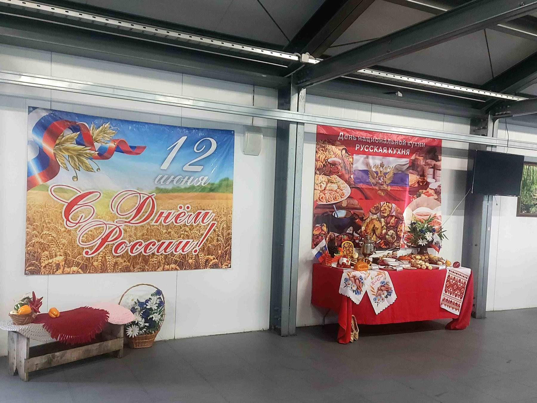 Над оформлением обеденного зала от души постарались в городе Ельна (Смоленской области). Стены украсили плакатами с гербом и флагом, а также природными видами родной страны: пшеничными полями. На столе – расшитые традиционным орнаментом рушники, глиняная посуда, флаги, цветы. Все это создает особую торжественную обстановку и напоминает о культурном коде.