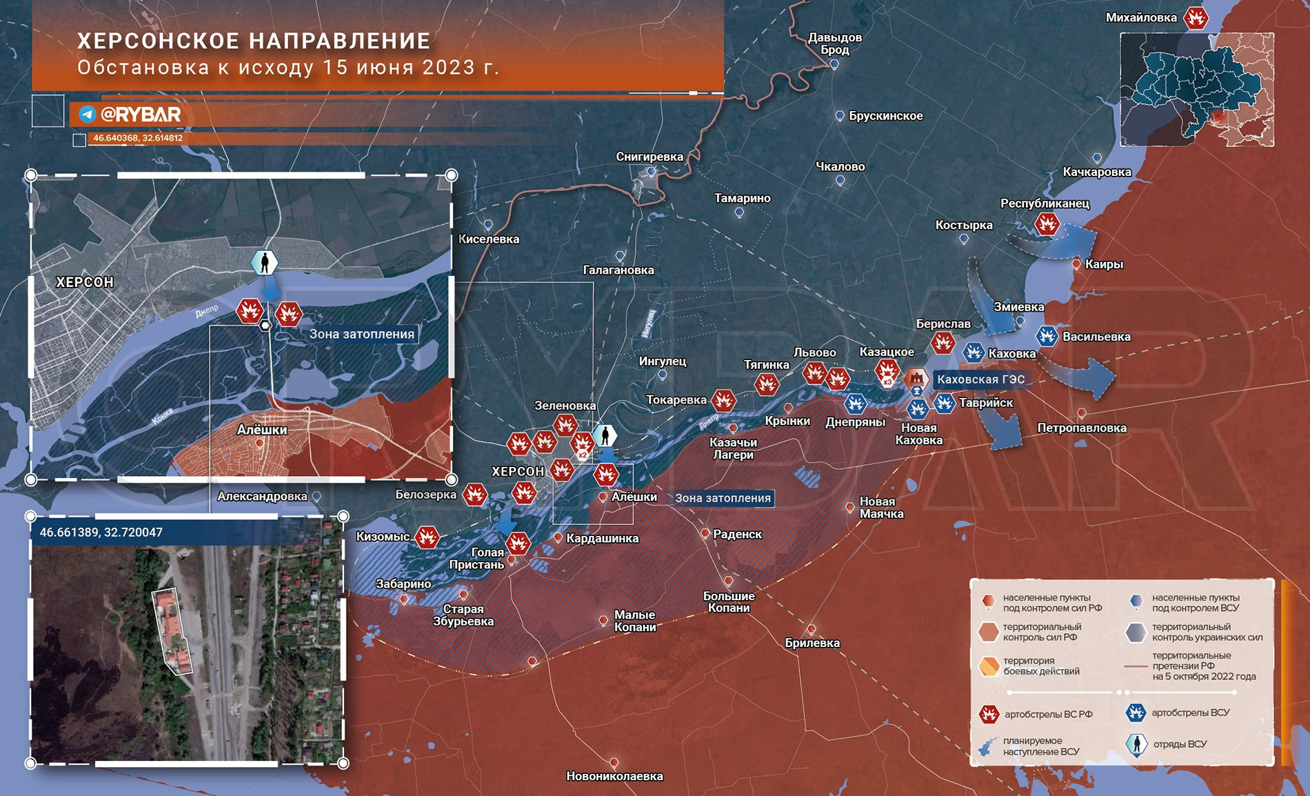 - Украинские формирования продолжают артиллерийскую подготовку по левому берегу Днепра: выпущено порядка 30 снарядов по Новой Каховке, Таврийску, Каховке и Васильевке. Днем под обстрел попали жилые дома в Днепрянах — погиб полуторогодовалый ребенок.