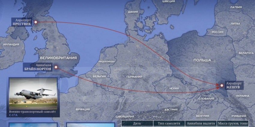 За прошедшую неделю Великобритания направила Украине около 130 тонн грузов. Данное число рассчитано исходя из максимальной грузоподъемности самолетов, сложно узнать точно, сколько вооружения и военной техники было на борту. Интересным является перелёт Falcon 900LX. Как правило, данный самолет используется для перевозки высокопоставленных военнослужащих.