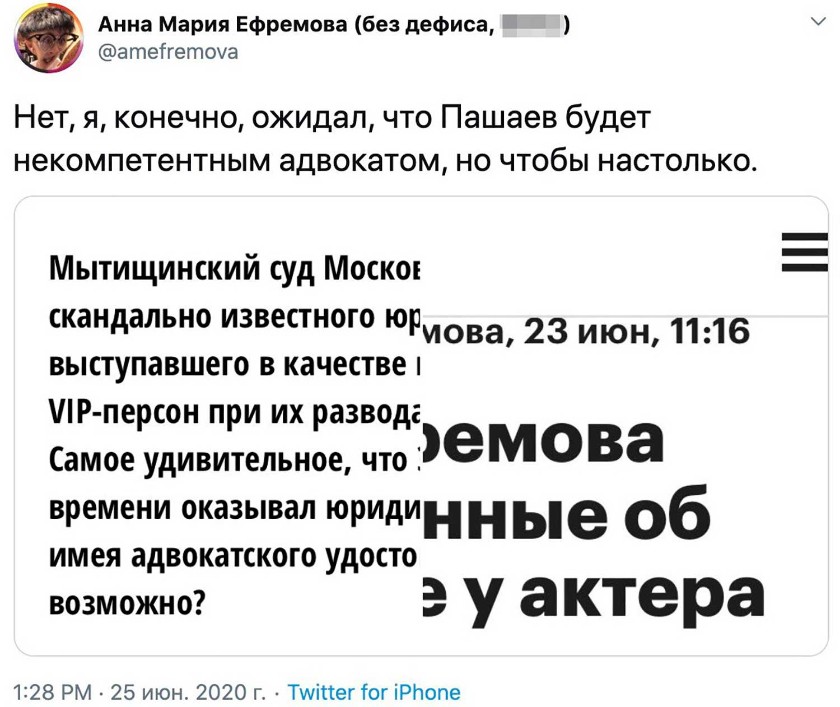 Старшая дочь актера, по ее словам, предполагала, что юрист окажется некомпетентным адвокатом, но не ожидала, что настолько. Девушка написала об этом в "Твиттер", прикрепив несколько новостей о защите отца.