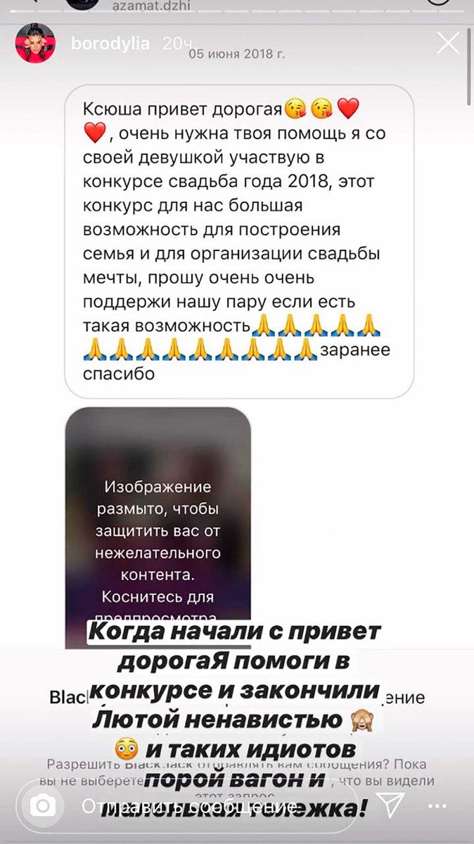 Бородина заглянула в свои сообщения в "Инстаграм" и наткнулась на очередного