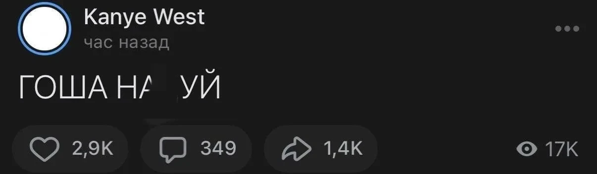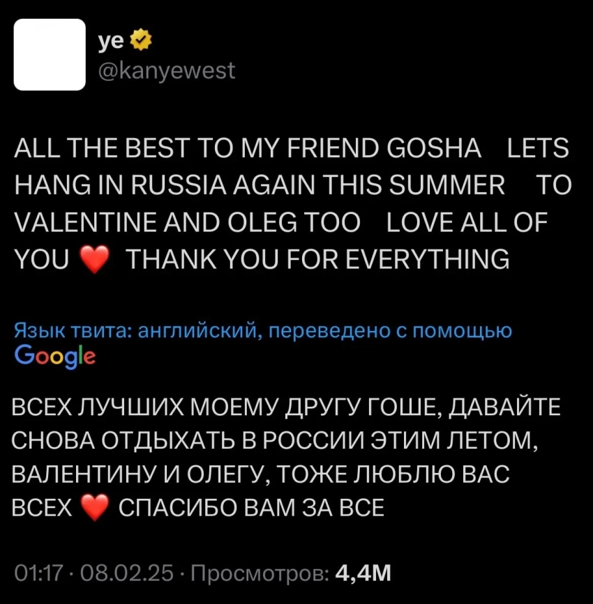 Фото: Скриншот из соцсетей Канье УэстаФото: Скриншот из соцсетей Канье УэстаПозже Уэст вновь обратился к 40-летнему Рубчинскому, на этот раз в соцсети X (бывший Twitter, заблокирован в РФ). Он написал, что считает Гошу другом и поблагодарил его за все, а также предложил ему этим летом еще раз встретиться и “затусить” в Москве.