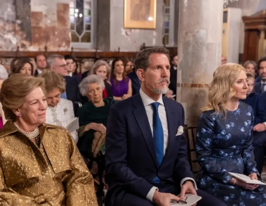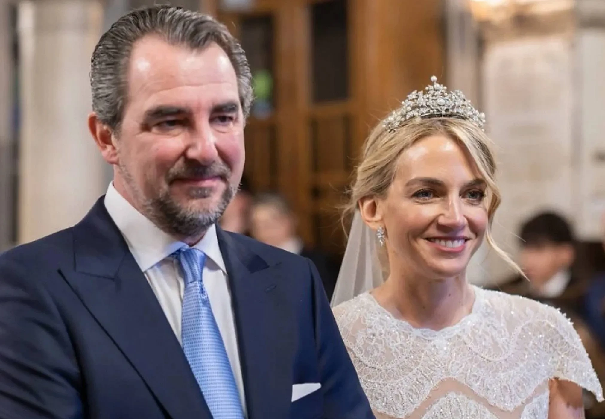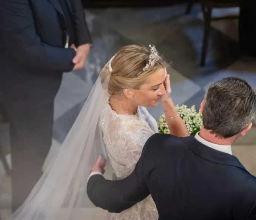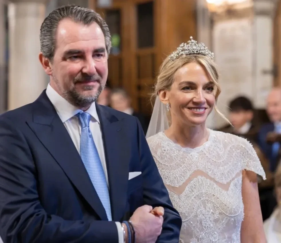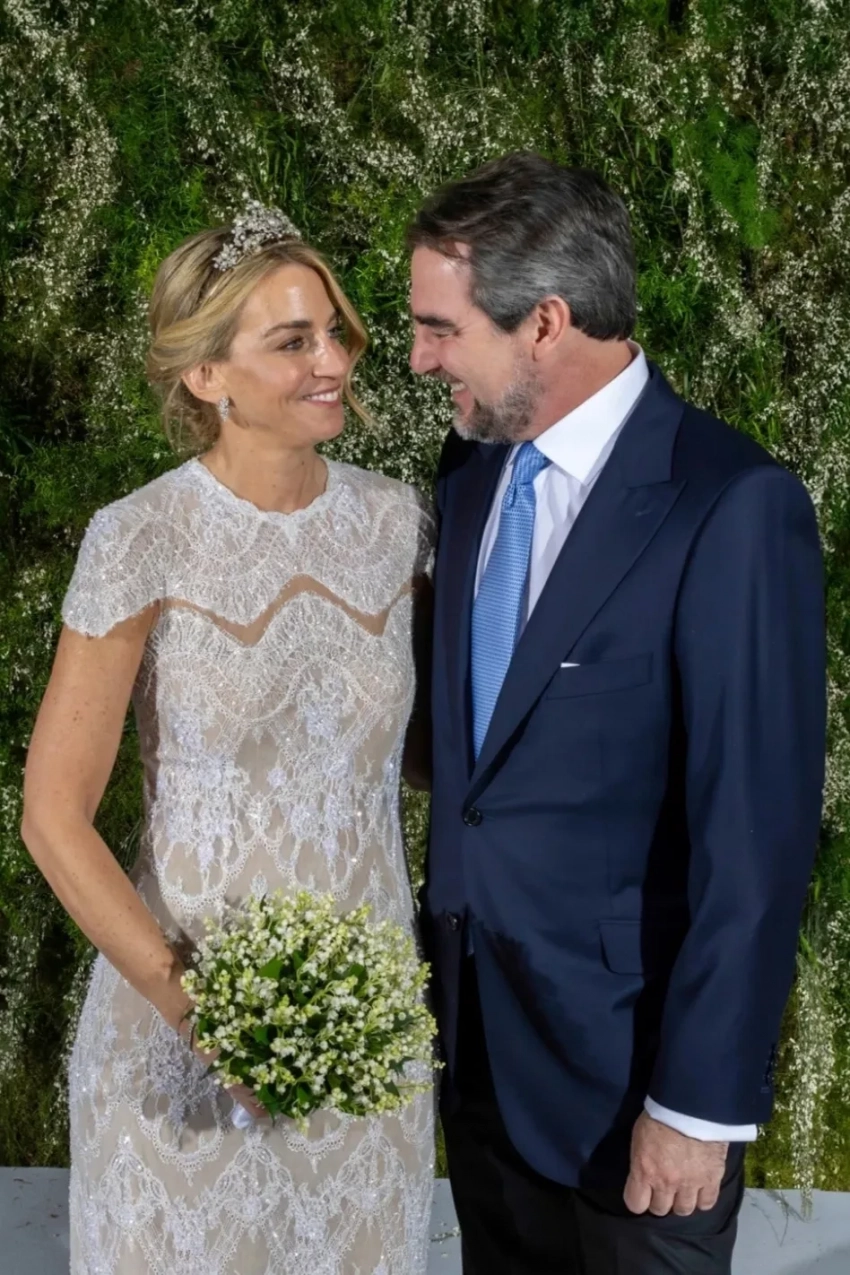Церемония бракосочетания состоялась в храме Святого Николая Чудотворца в Афинах. Невеста прошла к алтарю в платье авторства греческого дизайнера Христоса Костареллоса, украшенном французским кружевом и расшитом вручную бисером. Образ дополняло фамильное украшение — тиара “Корсаж”, которая некогда принадлежала королеве Анне-Марии.