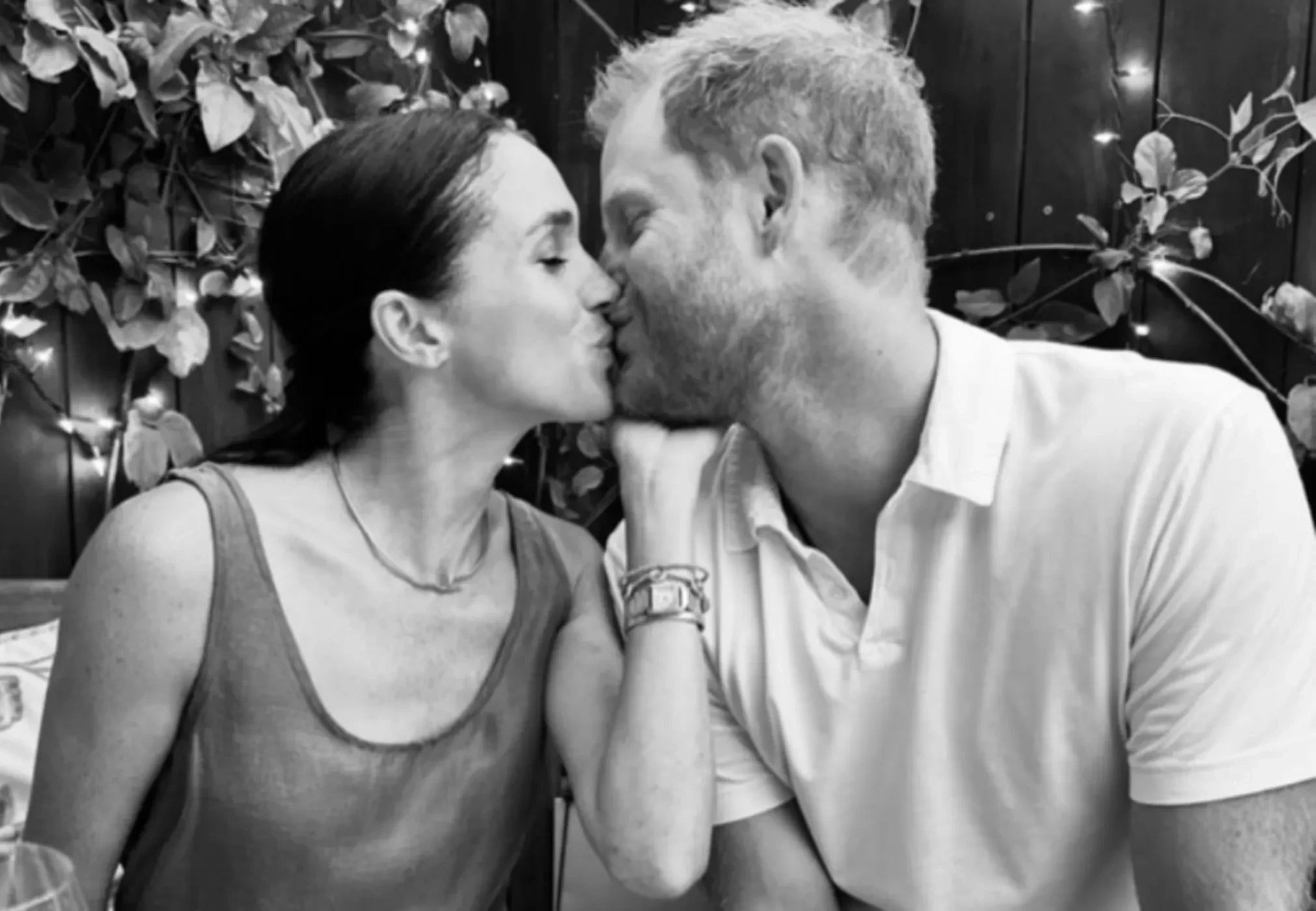 В честь Дня святого Валентина Меган Маркл поделилась совместным фото с принцем Гарри. На чёрно-белом снимке супруги запечатлены в момент поцелуя. Они сидят за столом на открытой террасе, а за их спинами виднеется декоративная зелень и огоньки.