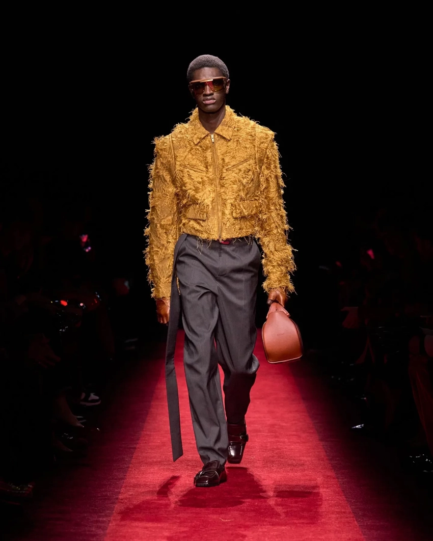 Эд Вествик/Фото: ferraristyle/instagram*Омар Аюсо/Фото: ferraristyle/instagram*Тина Кунаки/Фото: ferraristyle/instagram*Аличе Пагани/Фото: ferraristyle/instagram*Матео Чеккарини и Ева Риккобоно/Фото: ferraristyle/instagram*Элли Туманн/Фото: ferraristyle/instagram*Жан-Карло Леон/Фото: ferraristyle/instagram*Карен Бланчард/Фото: ferraristyle/instagram*Под руководством креативного директора Рокко Янноне бренд представил коллекцию, вдохновлённую динамикой легендарных автомобилей Ferrari. Коллекция открылась с переосмысления делового стиля: серые плиссированные костюмы сочетались с массивными меховыми и верблюжьими пальто и дополнялись галстуками Rosso Corsa. Среди ключевых элементов коллекции — меховые пальто, золотые ткани с бахромой и кожаные аксессуары. Фирменной деталью, возвращающейся из сезона в сезон, стали перчатки — неизменный атрибут поклонников Ferrari.