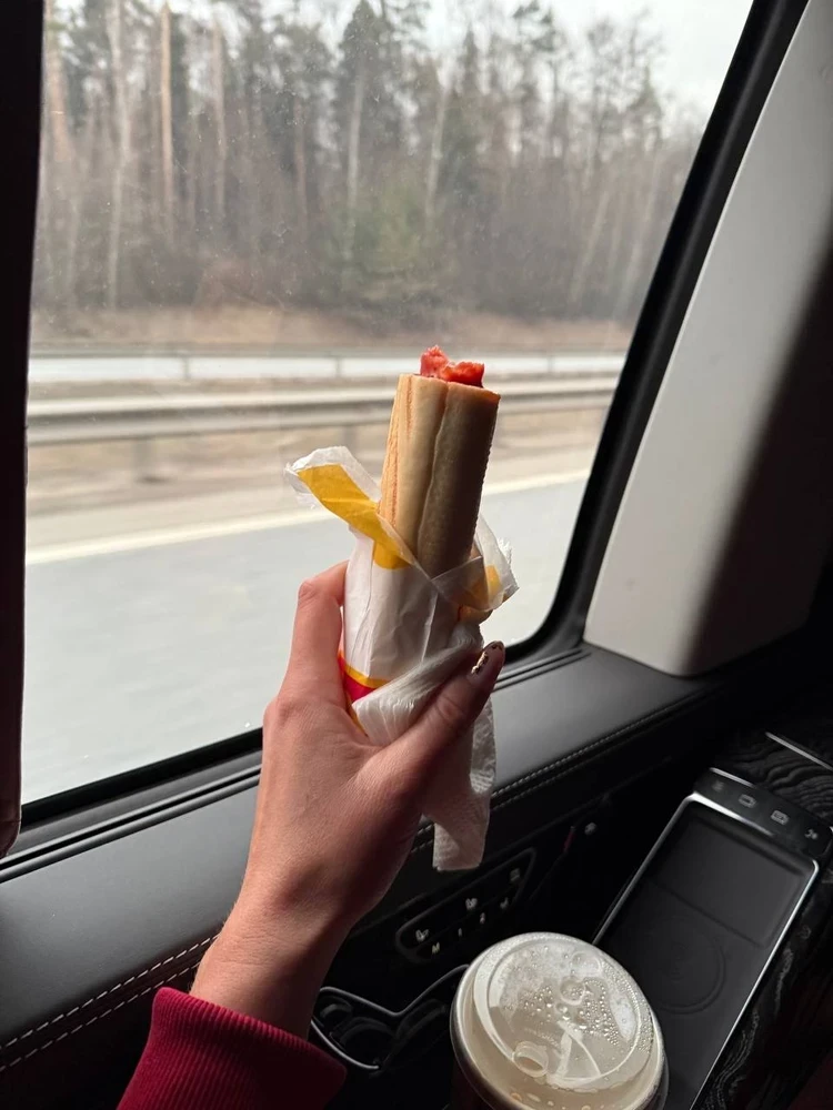 После чего Бузова выложила еще один кадр из машины с уже надкусанным хот-догом.