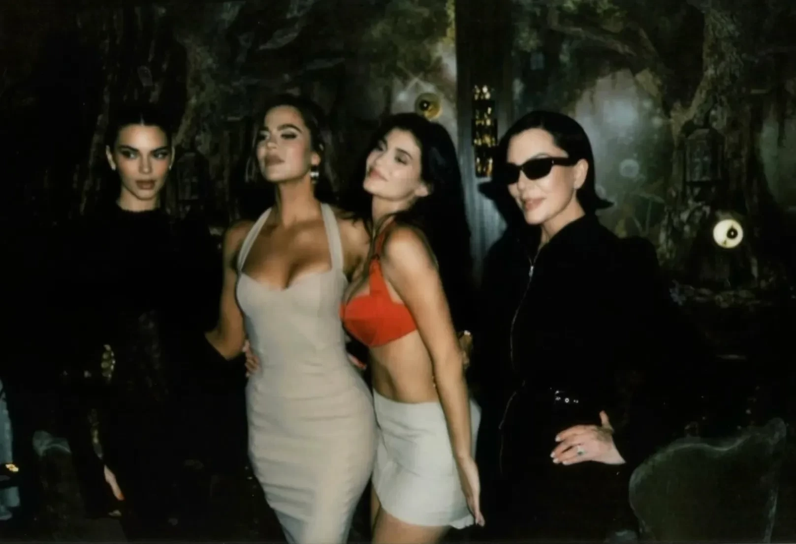 Для вечера Кайли выбрала красный топ и бежевую мини-юбку, а "помолодевшая" после пластики Крис Дженнер позировала в чёрном комплекте и солнцезащитных очках. Хейли Бибер и Кендалл Дженнер появились в нарядах из новой коллекции: Хейли — в платье телесного цвета, а Кендалл — в чёрном облегающем макси с полупрозрачной корсетной вставкой.
