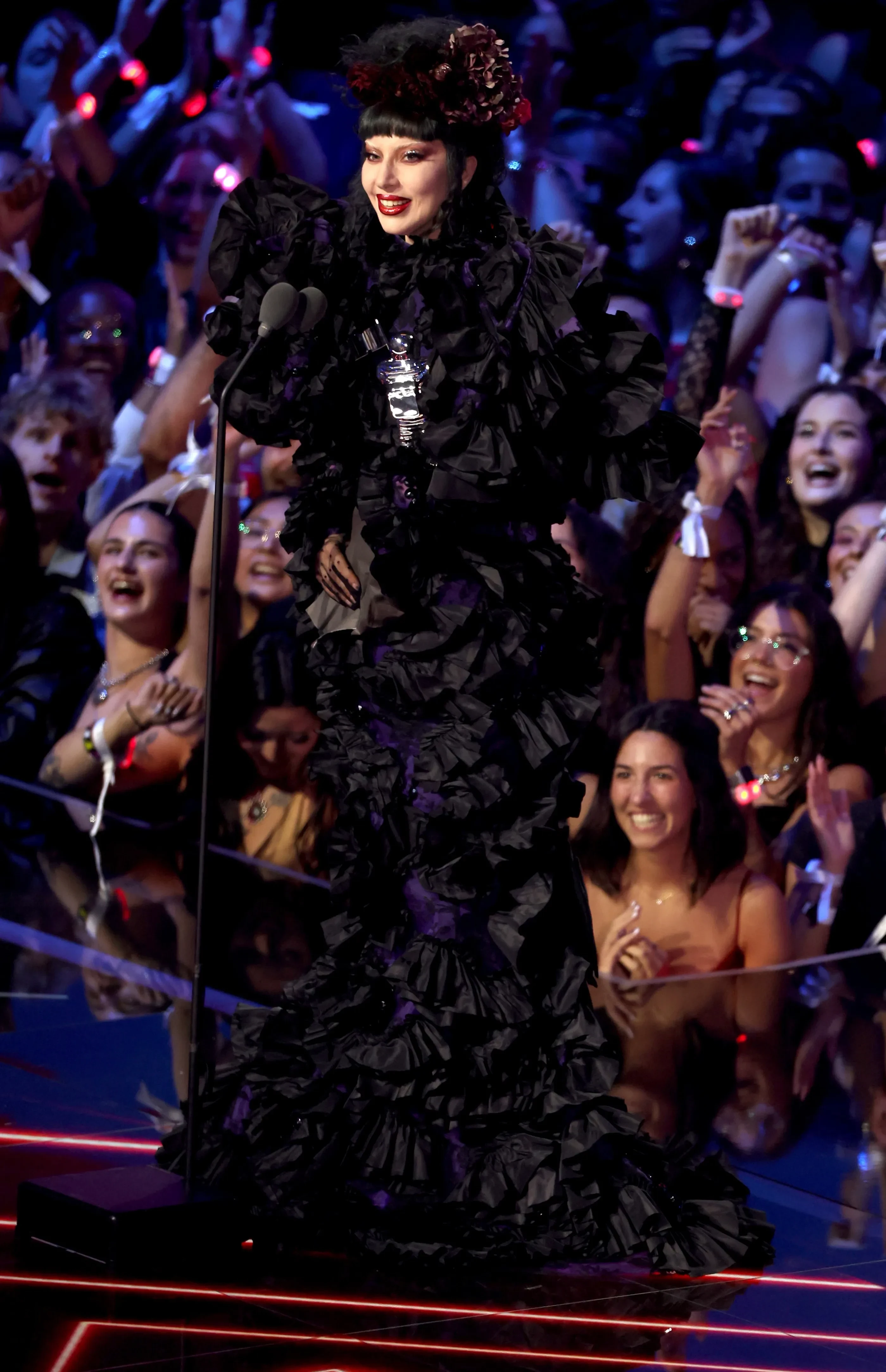Сабрина КарпентерЗвездой вечера стала 39-летняя многократная обладательница премии MTV VMA Леди Гага, на счету которой в этом году 12 номинаций. Она стала "Артистом года", а также победила в номинациях "Лучшая художественная постановка", "Лучшая режиссура" и "Лучшая совместная работа" за дуэт с Бруно Марсом Die With a Smile. На сцену Гага вышла в платье Marc Jacobs.
