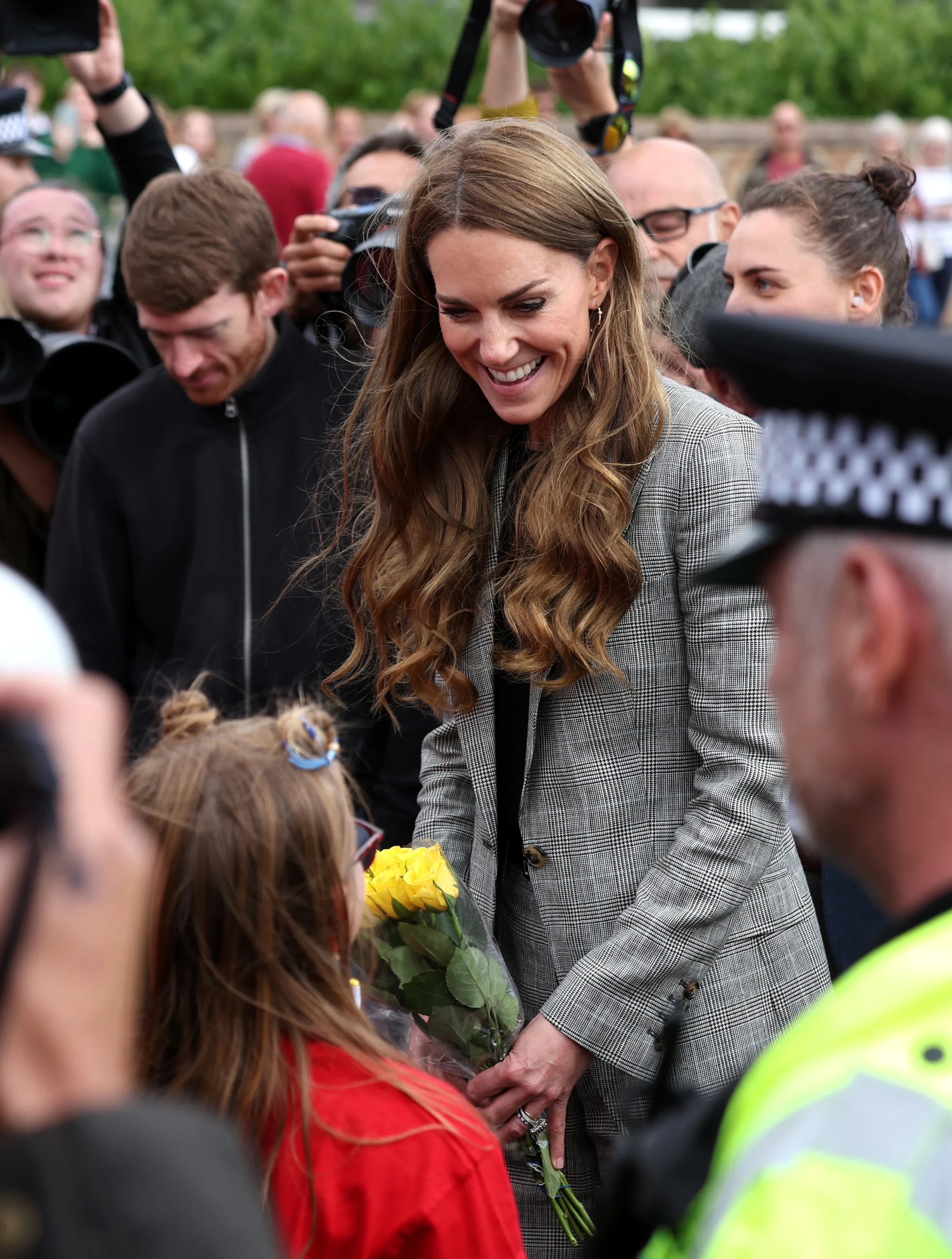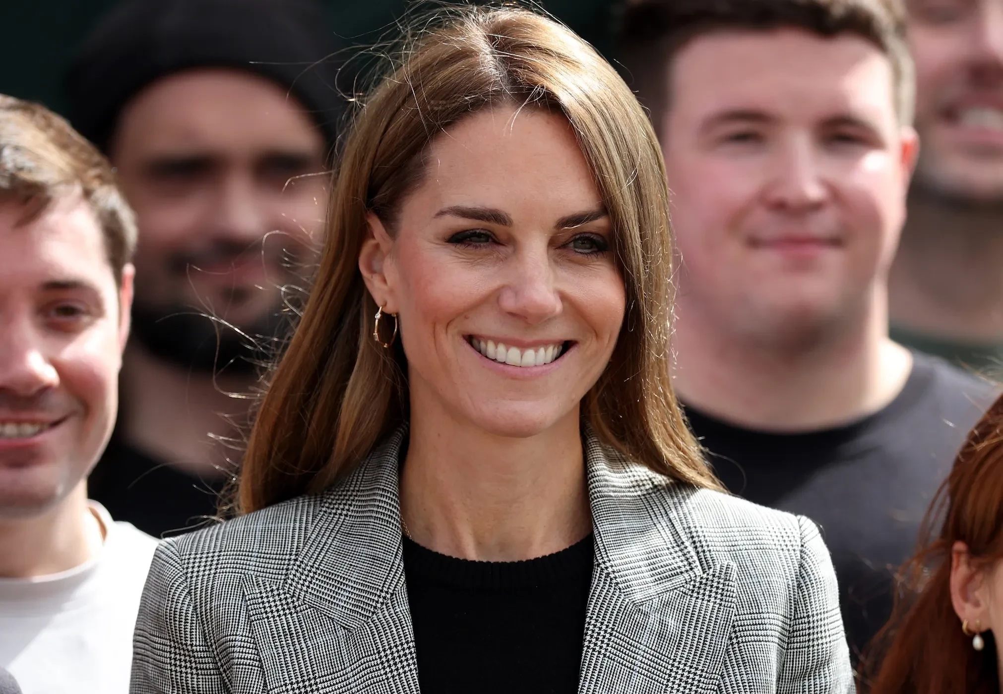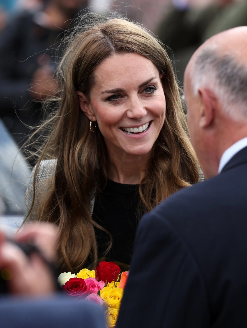 43-летняя принцесса Уэльская появилась на публике в сером брючном костюме и с распущенными волосами на фоне слухов о том, что она носит парик из-за рецидива рака. Она улыбалась и пообщалась с местными работниками и жителями деревень.