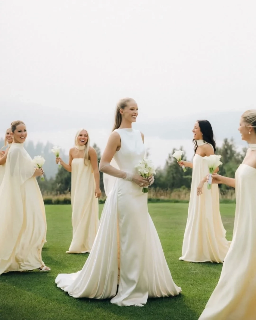 Торжество было организовано в городке Кёр-д’Ален в Айдахо и продолжалось три дня, так что невеста успела продемонстрировать несколько нарядов. На репетиционный ужин она надела платье Zimmerman с длинными рукавами, асимметричным подолом и отделкой, напоминающей лепестки цветов. А на приветственное барбекю в стиле вестерн — кружевное платье Bec + Bridge, чёрные ковбойские сапоги и чёрную шляпу.