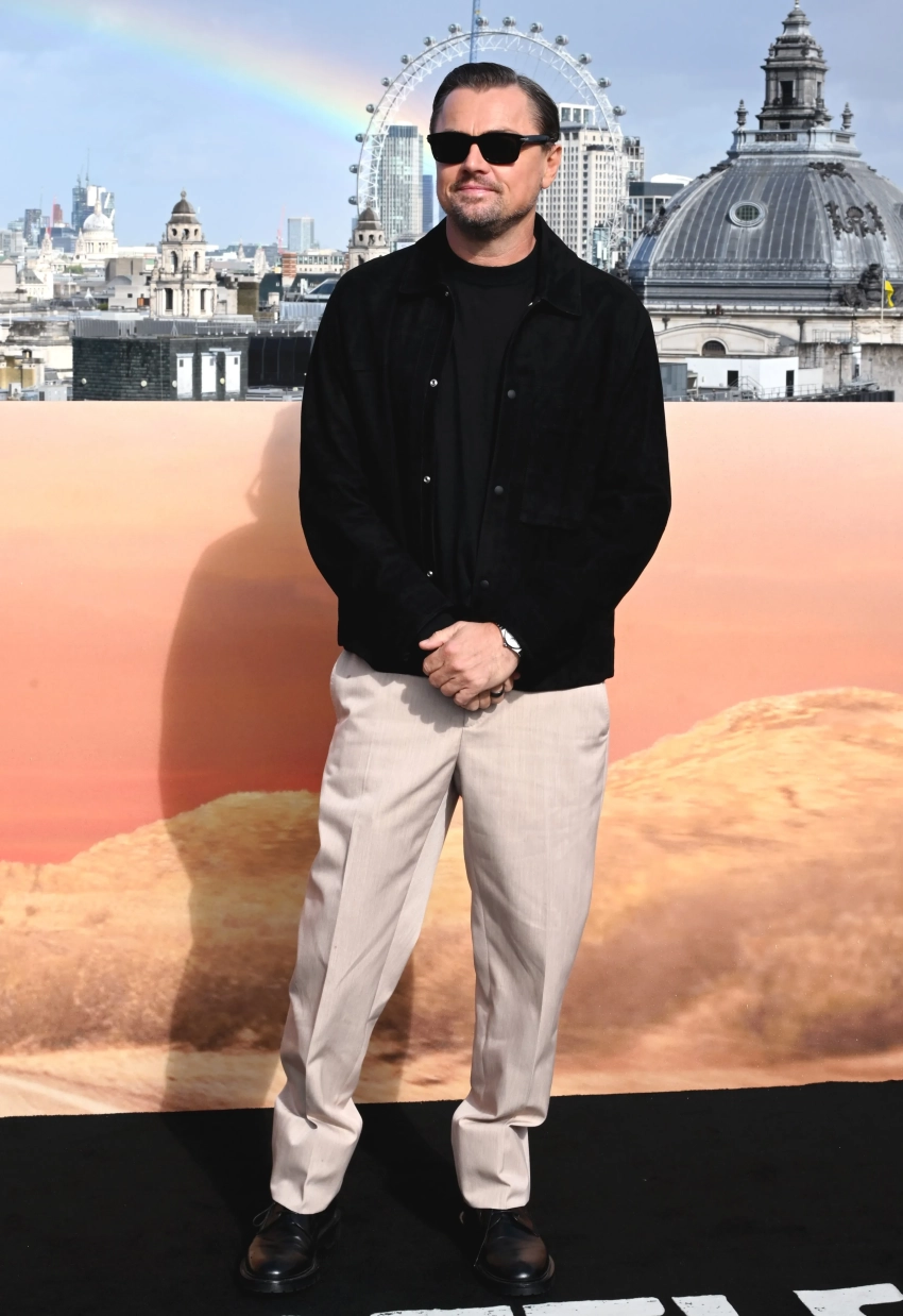 ДиКаприо, который два года встречается с супермоделью Витторией Черетти, был одет в чёрную куртку, футболку и бежевые брюки, дополнив образ солнцезащитными очками.