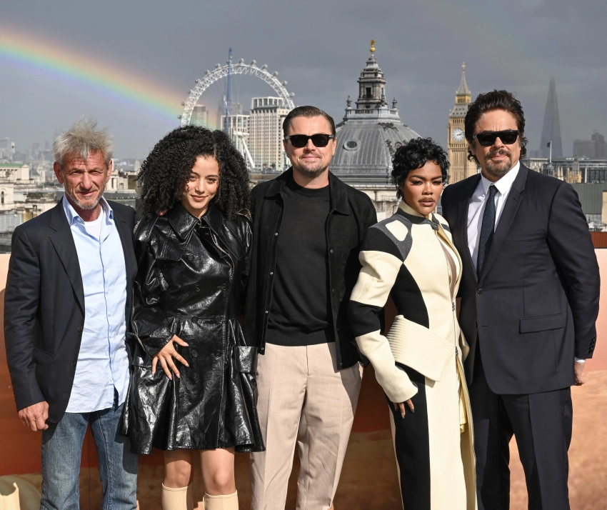 50-летний Леонардо ДиКаприо посетил фотоколл своего нового фильма "Битва за битвой" в Лондоне. Актёр позировал фотографам вместе с коллегами: 65-летним Шоном Пенном, Бенисио дель Торо, 25-летней актрисой Чейз Инфинити и Тейаной Тейлор.