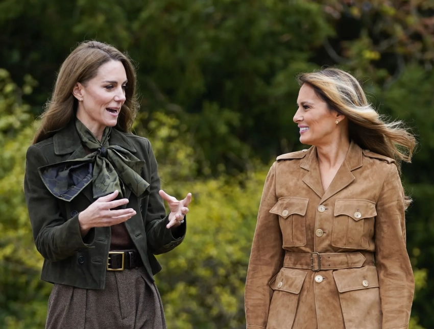 В последний день государственного визита Трампов 43-летняя принцесса Уэльская и первая леди США посетили сады и коттедж Фрогмор в Виндзоре, где встретились с участниками скаутской программы "Белки" и их лидером Дуэйном Филдсом. Кейт, которая с 2020 года является сопрезидентом Скаутской ассоциации, была одета в шерстяную коричневую юбку и зелёный жакет с бантом, а 55-летняя Мелания выбрала для мероприятия замшевый жакет с поясом и светлые брюки.
