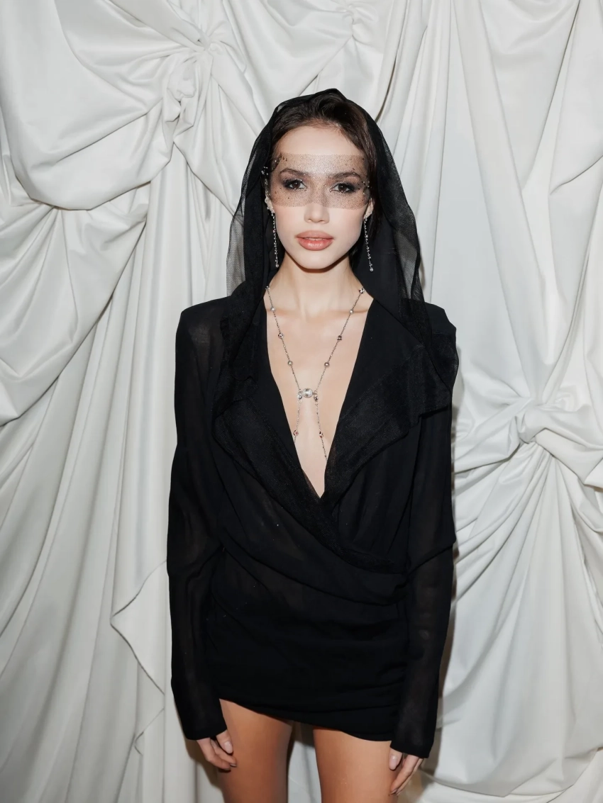 Для выхода в свет Алина выбрала чёрное мини-платье с глубоким декольте и капюшоном. Образ дополнили прозрачная маска со стразами и босоножки на шпильке.
