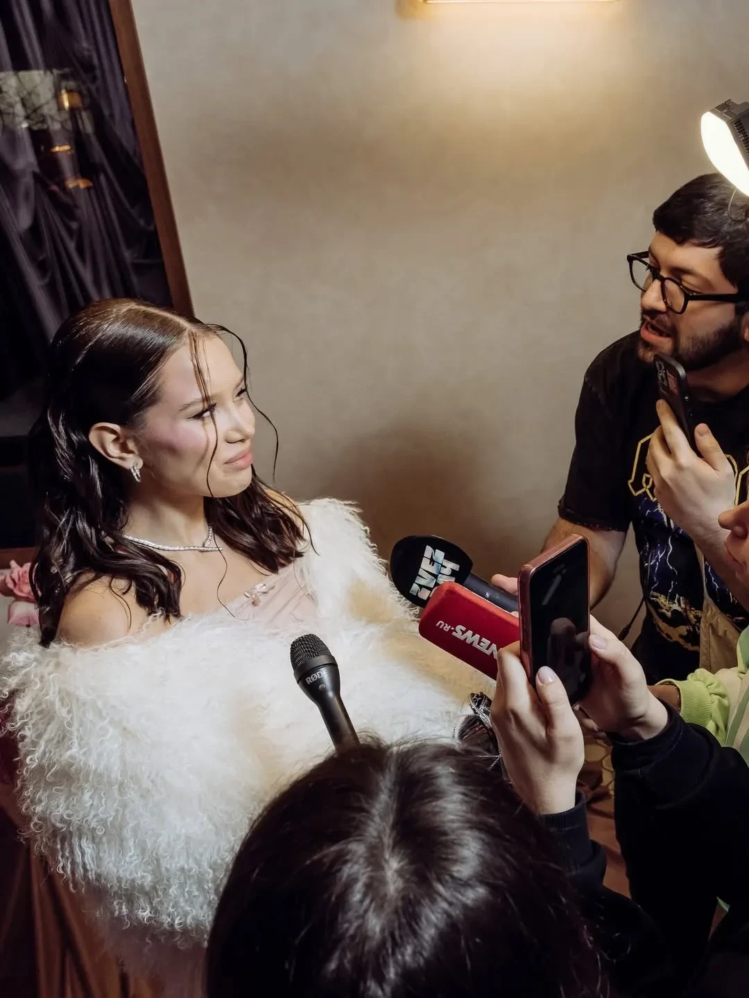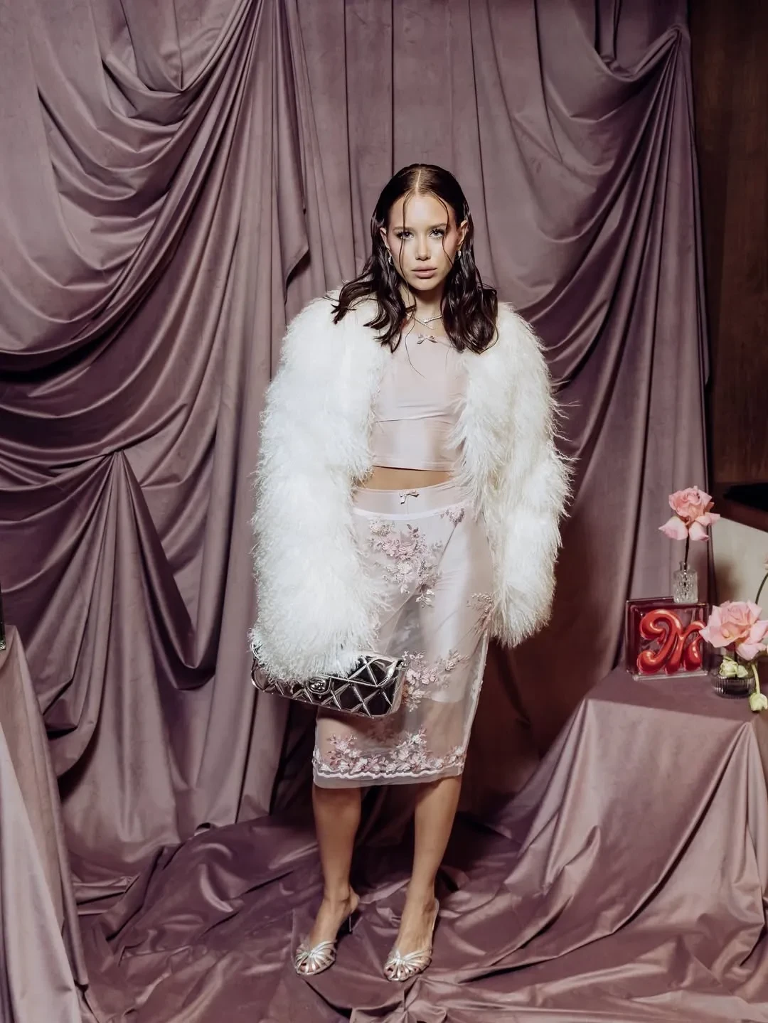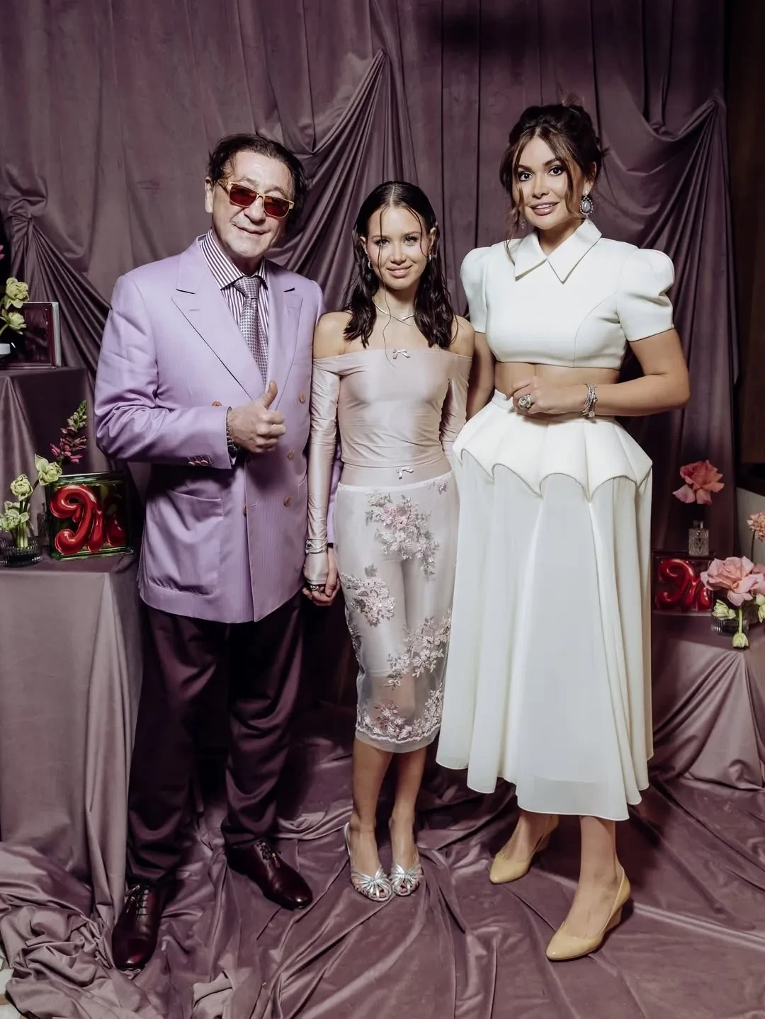 Аврора Киба пришла на мероприятие в розовом образе — в прозрачной юбке с цветочной вышивкой, которую она надела с шортами, и топе с открытыми плечами. Свой наряд она дополнила короткой белой шубой и серебристым клатчем Chanel. Лепс тоже выбрал наряд в розово-лиловых оттенках. Пара вместе позировала фотографам, держась за руки.