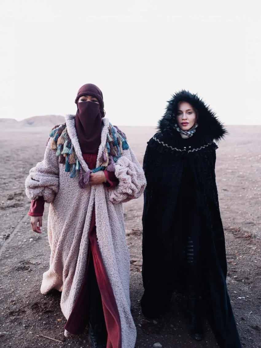Певица устроила семейную фотосессию в пустыне. На снимках она позирует в шубе, солнцезащитных очках, ковбойской шляпе и сапогах, а также других нарядах. На фото также запечатлены: 25-летний сын Рокко Ричи от бывшего мужа Гая Ричи, приёмные дочери Мерси, Стелла и Эстер, а также приёмный сын Дэвид Банда и бойфренд Аким Моррис. "Марокко. Я не могу отпустить тебя!" — подписала фото поп-звезда.