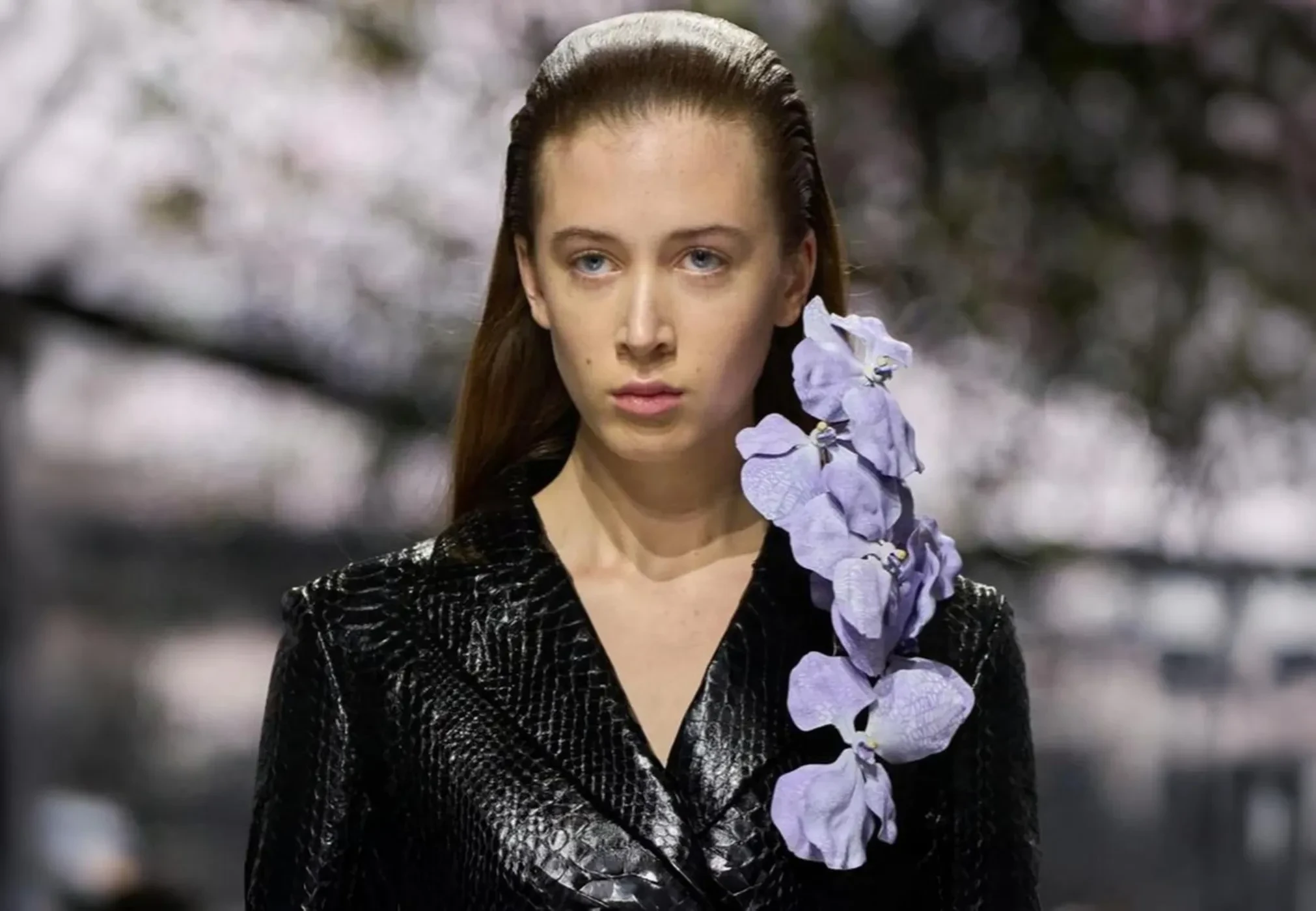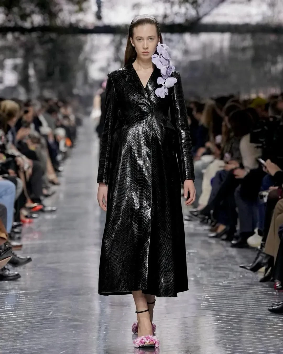 Сандэй Роуз появилась перед камерами в длинном чёрном пальто с текстурой под кожу крокодила, украшенном крупной сиреневой орхидеей на лацкане. Для показа она сменила цвет волос на более тёмный с красноватым оттенком.
