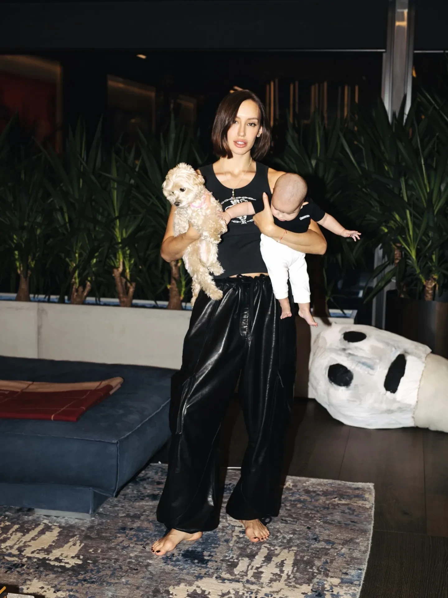 На фото Иванова в чёрной майке и кожаных штанах позирует в обнимку с пятимесячной девочкой у себя дома. На некоторых кадрах к ним также присоединяется питомец Валентины, собачка породы мальтипу по кличке Киви. "Мой дом там, где есть вы", — подписала публикацию модель.