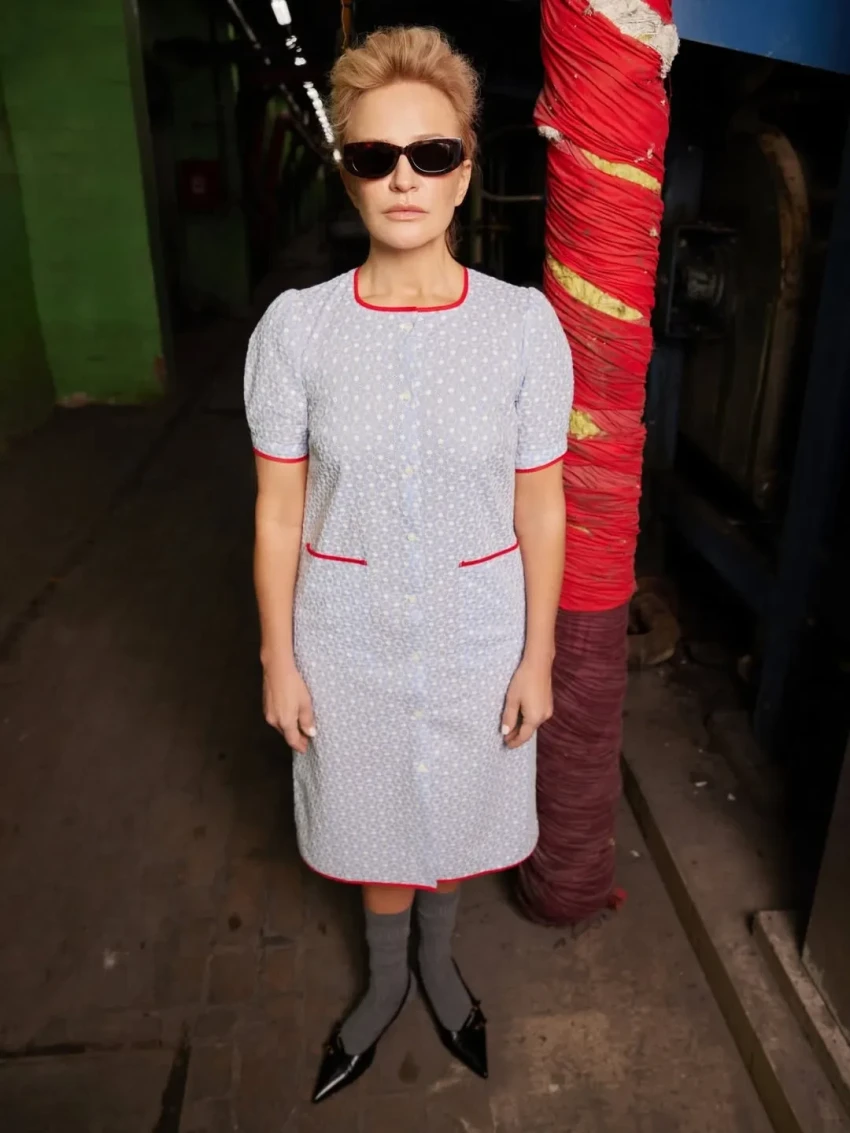 Шелягова примерила фартуки, платья и сарафаны с уникальными принтами, которые были специально отобраны и воссозданы художниками Шуйской фабрики по архивным образцам XVIII—XIX веков и перенесены на современный ситец.