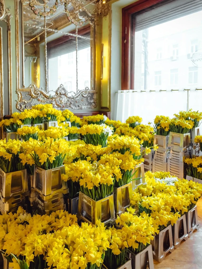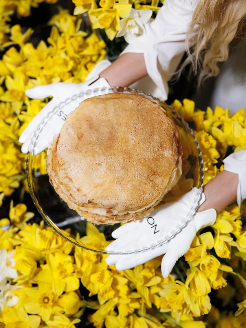 Праздничным дресс-кодом стали образы в жёлто-белой цветовой гамме, напоминающей о нарциссах, которыми было украшено всё пространство. Столы ломились от угощений: наряду с традиционными блинами и оладьями присутствующих угощали пирожками с мясом и капустой, соленьями, шоколадными конфетами и петушками на палочке, которые предлагали запивать травяным чаем и настойками.