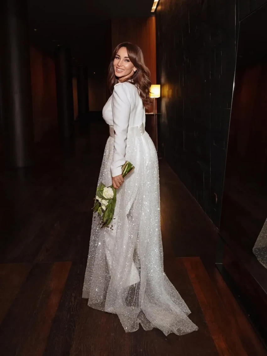 Фото Анфисы ЧеховойНа роспись в ЗАГСе ведущая пришла в белом комбинезоне бренда Ammonit, а на вечеринку переоделась в платье Magirani с декольте. В начале празднования жених и невеста станцевали танец молодожёнов под хит Селин Дион All By Myself, а после отмечали с гостями и тамадой.