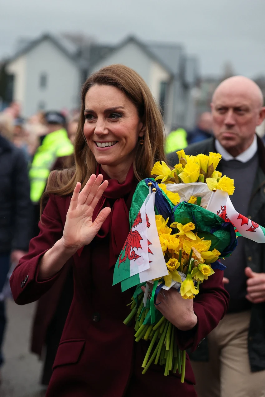 Для визита 44-летняя Кейт выбрала образ в бордовых оттенках: она была в любимом красном пальто от Alexander McQueen, которое уже не раз носила на публике, блузе с бантом, макси-юбке и высоких лакированных сапогах. 43-летний Уильям предпочёл коричневый пиджак, синий джемпер и брюки прямого кроя. На груди у пары красовались одинаковые броши в виде нарциссов — символа святого Давида, который традиционно носят в день праздника как знак уважения к валлийскому наследию.